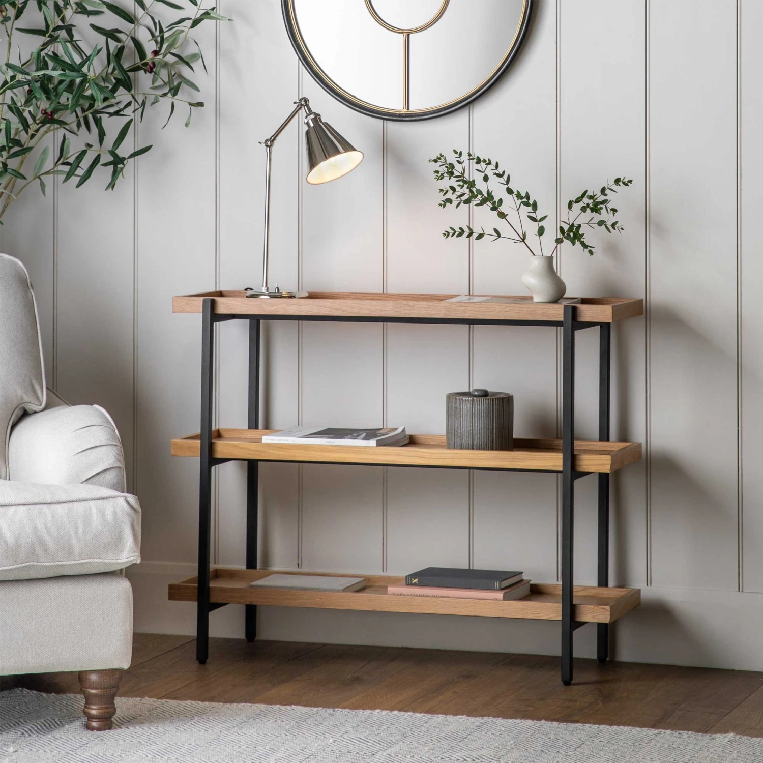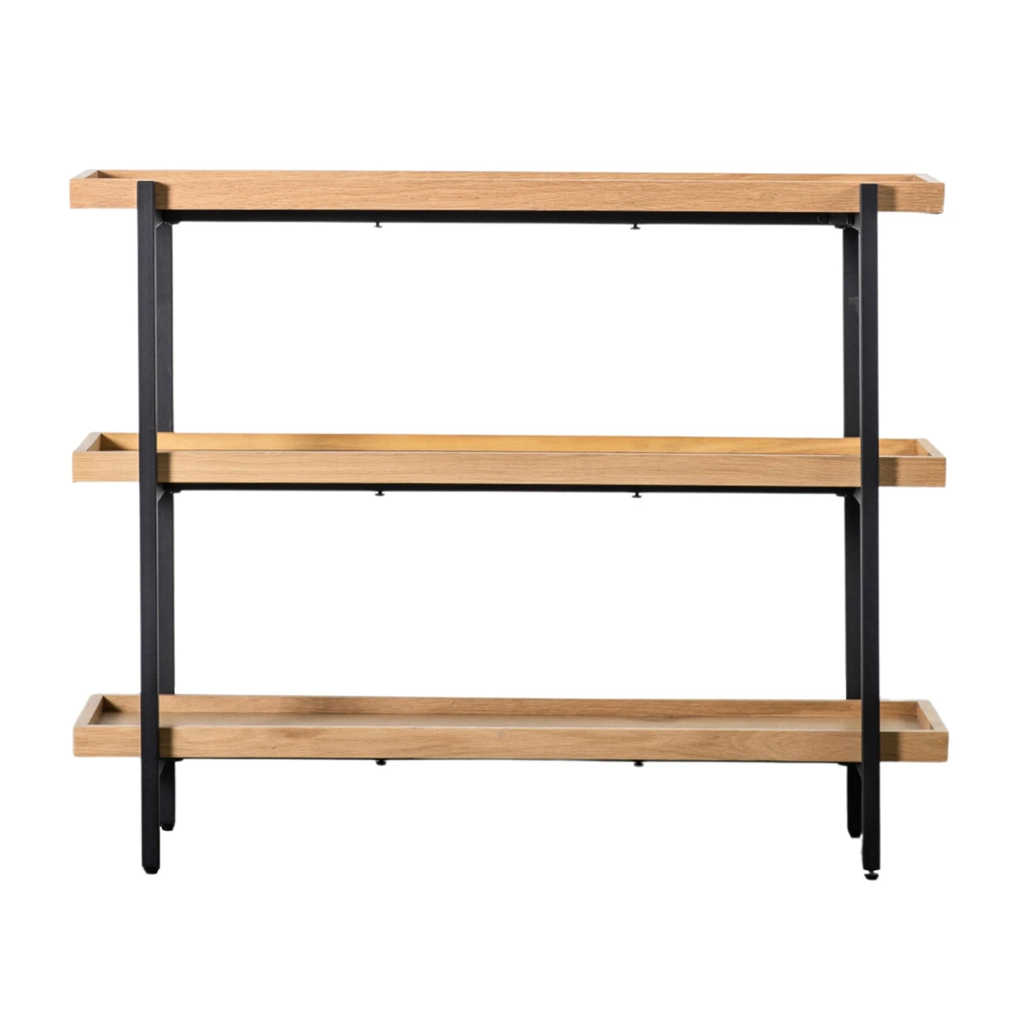Offering your home a stunning contemporary design, this Torrington Small Open Display Unit provides 3 shelves of storage for household items and decorative staples. Complete with a black iron metal frame with tray style oak wooden shelves, it has a natural wood grain finish that makes it easily blendable to a modern decor style. Suitable to place in a dining area or lounge, it will make the perfect addition, creating a decorative statement or a practical storage facility.