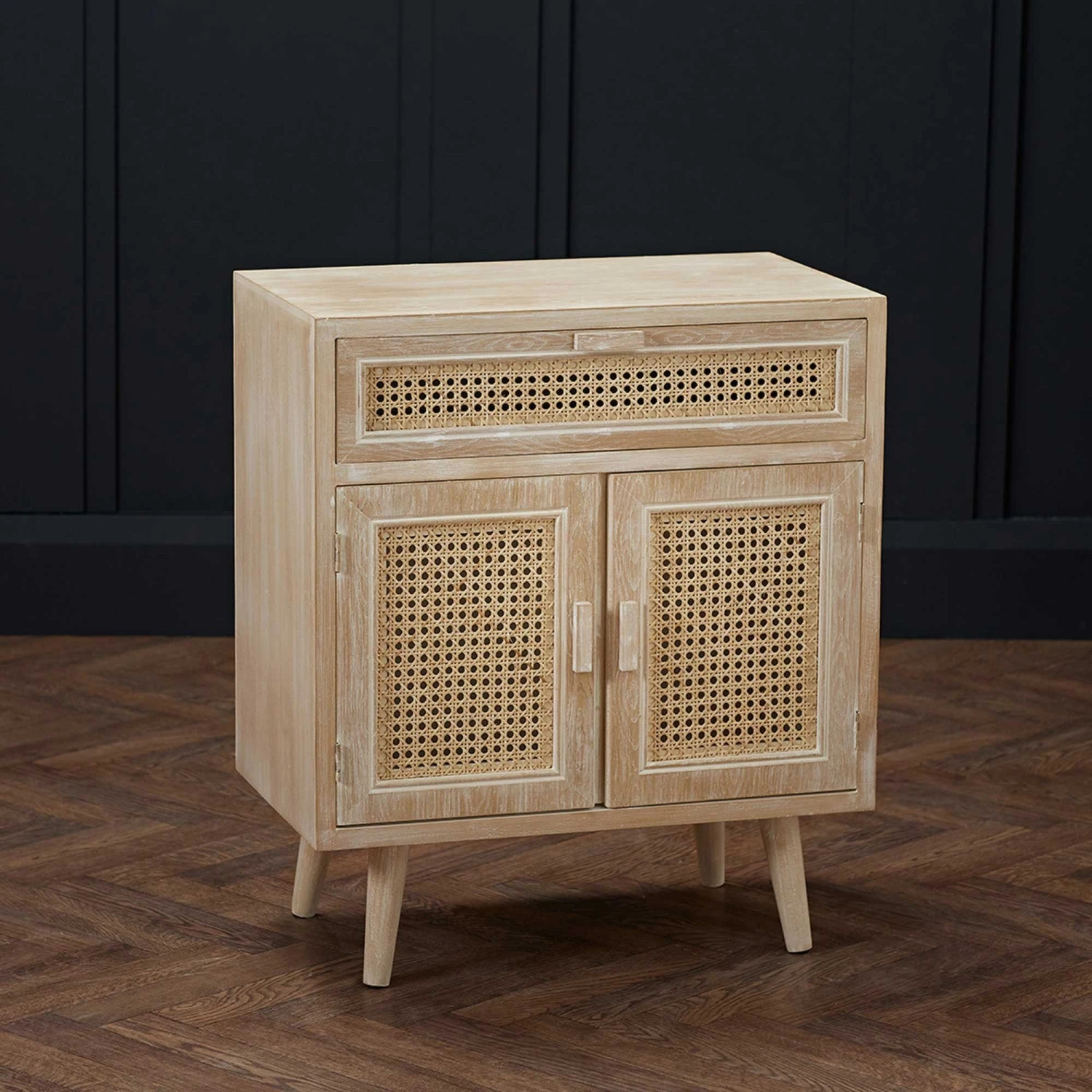 This on trend Toulouse 2 Door 1 Drawer Rattan Cabinet features 2 doors and 1 drawer with plenty of storage! The rattan style panels are the highlight of this design and makes for decorative door and drawer panels. This cabinet is finished in light washed oak effect and will be an asset to any room. Part of the Toulouse range.