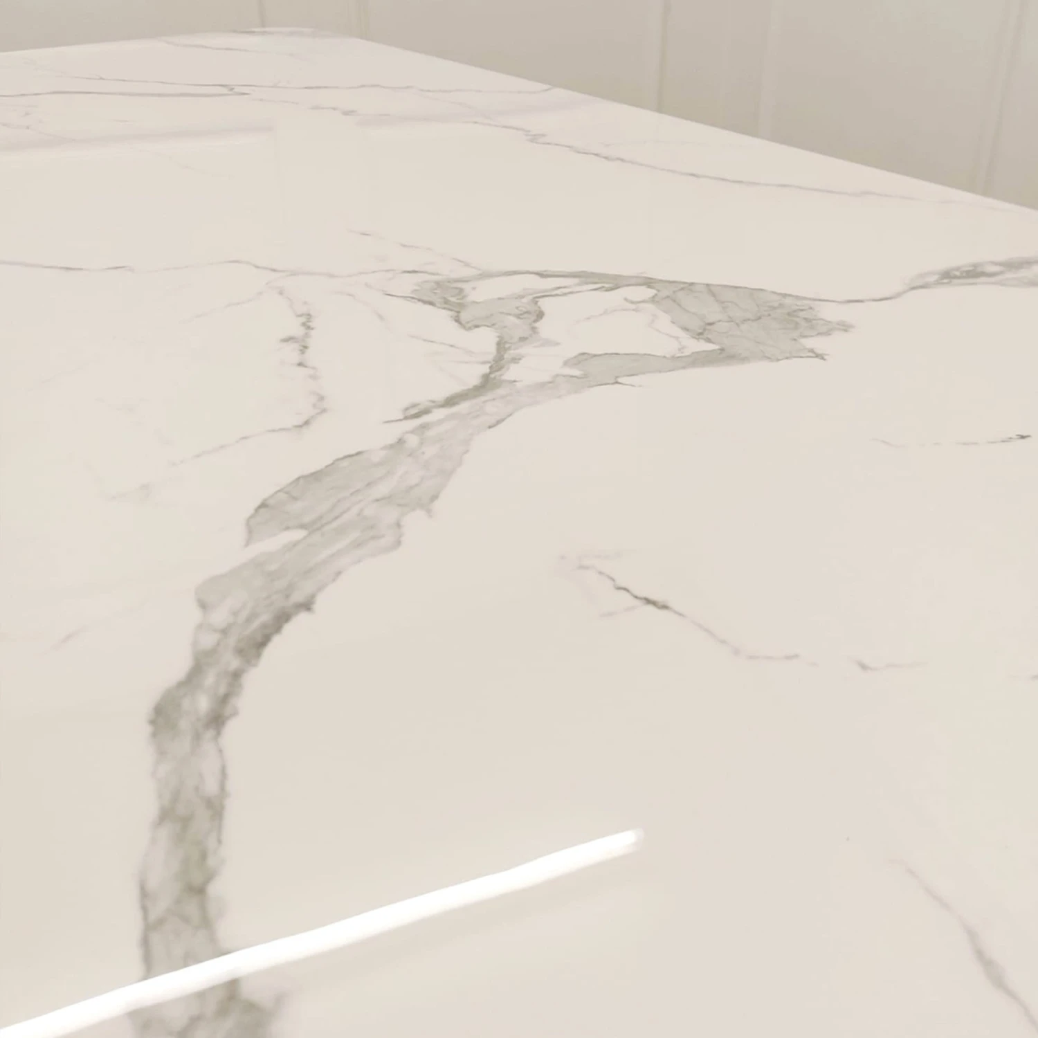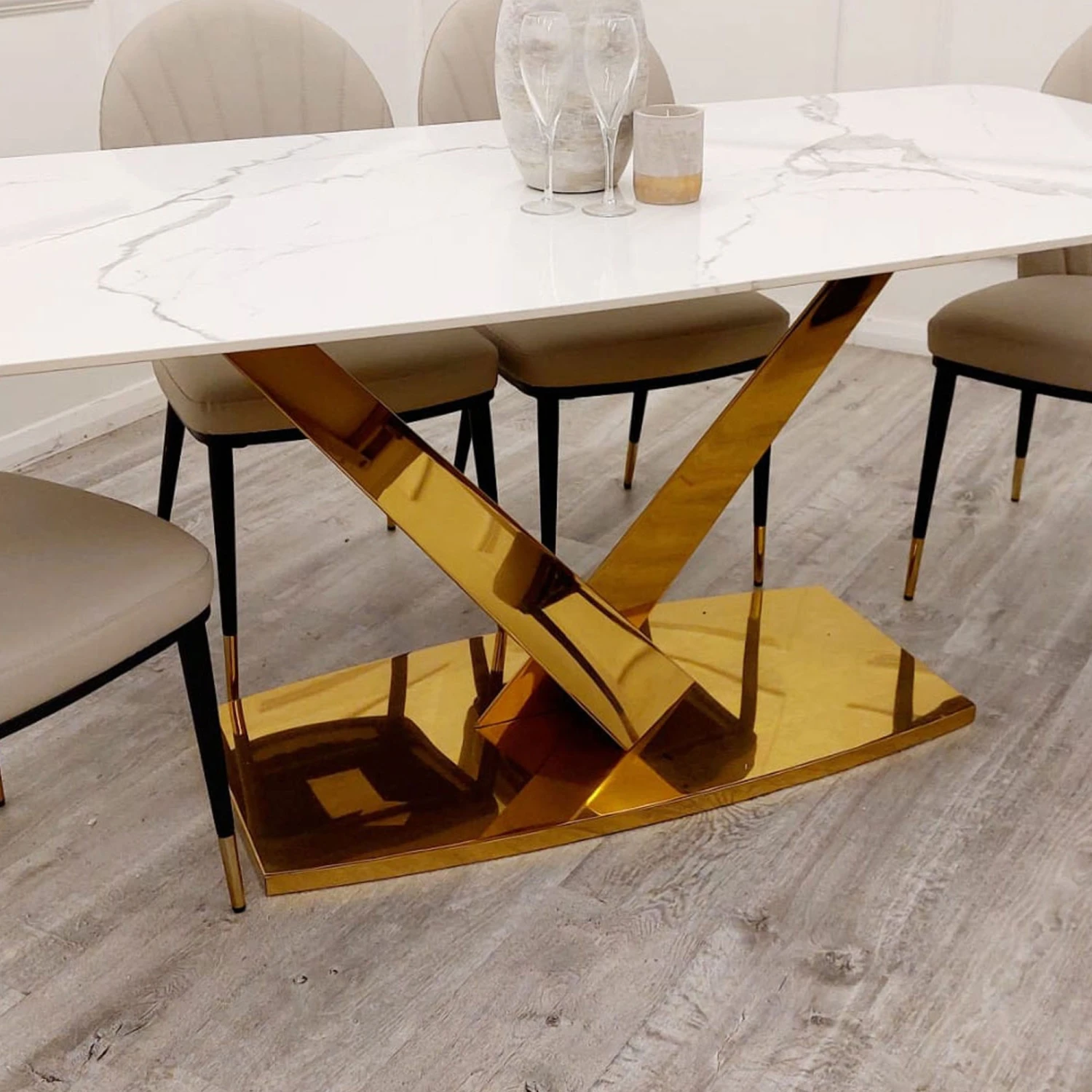 A popular addition to our range of luxury dining tables, the Valeo Gold 1.8 Dining Table with Polar White Sintered Stone Top is rectangular in shape with a gold metal pedestal curved base and topped with a polar white stone tabletop. Contemporary in design, it’s a luxurious piece of dining room furniture that grabs attention and oozes class and sophistication, allowing you to dine in style.