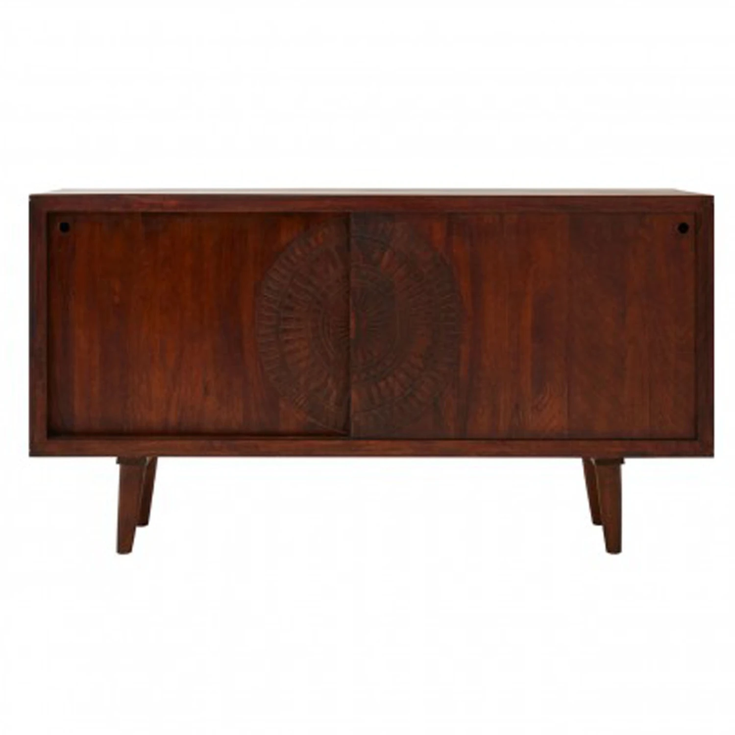 This is the Venice Sideboard. This breathtaking sideboard is made from sustainable dark mango wood. The natural wood markings are exquisite and flowing through the whole piece and a bohemian style pattern is carved in the front. The doors of the sideboard slide open, making this piece extremely space-savvy. The inside is separated by a shelf the runs right across the sideboard making this piece practical as well as extremely beautiful.